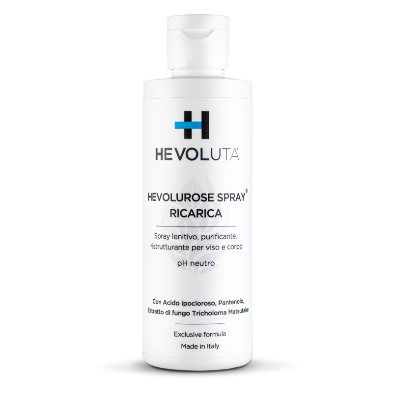 Hevolurose Spray è un tonico innovativo, purificante, lenitivo e ristrutturante per la pelle di viso e corpo, a base di Acido Ipocloroso, Pantenolo ed Ergotioneina.