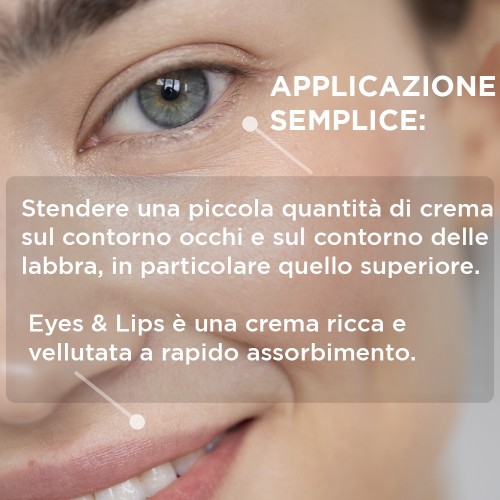 Eyes & Smile è una crema ricca per il contorno degli occhi e delle labbra che permette di ridurre i segni visibili del passare del tempo, ossia le rughe ai lati degli occhi e il cosiddetto "codice a barra" del labbro superiore.