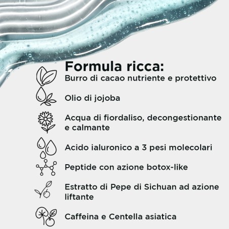 - Acido ialuronico a tre Pesi Molecolari (basso, medio e alto): con spiccata azione idratante a vari livelli dell'epidermide.