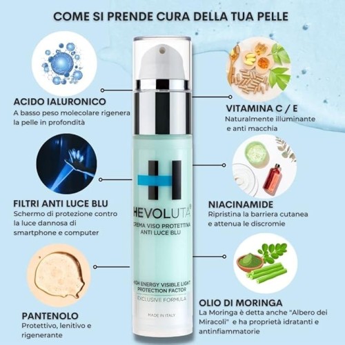 Hevoluta Crema Viso Protettiva anti Luce Blu contiene anche olio di Moringa, estratto di Verbascum thapsus, Acido ialuronico di piccole dimensioni, vitamina C stabilizzata, vitamina E, Pantenolo, Niacinamide e Riboflavina, con proprietà idratanti, schiarenti le macchia, anti radicali liberi, ristrutturanti e antirughe.