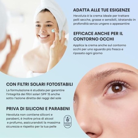 Hevoluta Crema Protettiva Anti Luce Blu è una crema da giorno per viso, collo e décolletté con più di 10 Sostanze Attive ad azione protettiva, idratante, antiossidante, antiinvecchiamento e anti-rughe (con SPF 15)