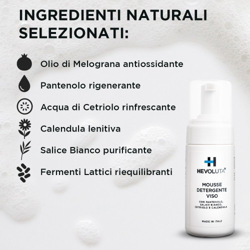Delicata e sensoriale mousse per detergere il viso e gli occhi, a base di Olio di Melograna antiossidante, Pantenolo rigenerante e protettivo, Acqua di Cetriolo rinfrescante e astringente, Acqua di Salice Bianco con azione dermopurificante, Calendula Tintura Madre calmante e lenitiva e Fermenti Lattici riequilibranti la barriera epidermica.
