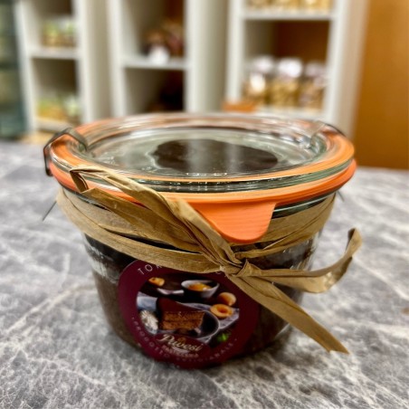 Torta Sacher artigianale cotta in vaso. Grazie al sottovuoto creato con la cottura in vaso profumi e aromi vengono perfettamente mantenuti nel tempo e senza l'aiuto di nessun tipo di conservante.