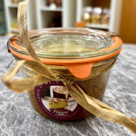 Torta di mele artigianale cotta in vaso. Grazie al sottovuoto creato con la cottura in vaso profumi e aromi vengono perfettamente mantenuti nel tempo e senza l'aiuto di nessun tipo di conservante.