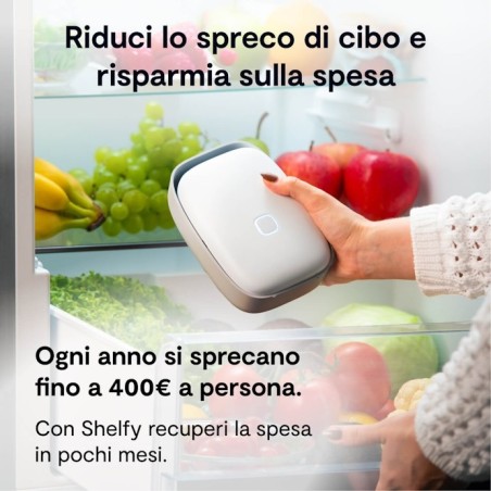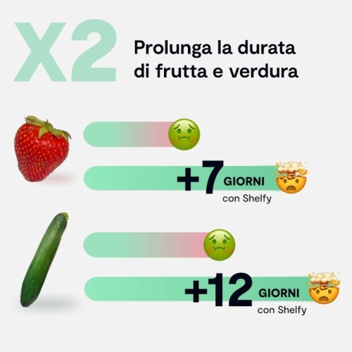 Nei test di laboratorio condotti, Shelfy ha dimostrato la capacità di prolungare la durata di conservazione di frutta e verdura fino a 12 giorni in condizioni specifiche. È importante notare che questo prolungamento della durata di conservazione è influenzato da vari fattori (come ad esempio la stagionalità del prodotto, le condizioni di pre conservazione, le caratteristiche del frigorifero, la frequenza di apertura delle porte del frigorifero, la corretta collocazione del prodotto all'interno del frigorifero, il sovraffollamento con altri prodotti, le fluttuazioni di potenza del frigorifero, ecc). Di conseguenza, non è possibile garantire risultati identici per tutti gli alimenti o per tutte le situazioni. Si consiglia di seguire sempre le linee guida per la conservazione e di non considerare il prodotto come una garanzia contro le malattie alimentari o il deterioramento. Si ricorda che Shelfy agisce sull'aria all'interno del frigorifero e non direttamente sugli alimenti.