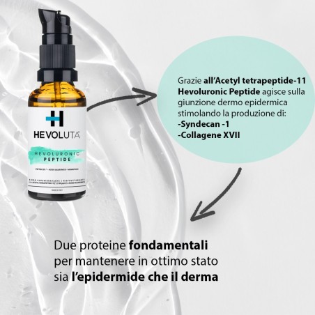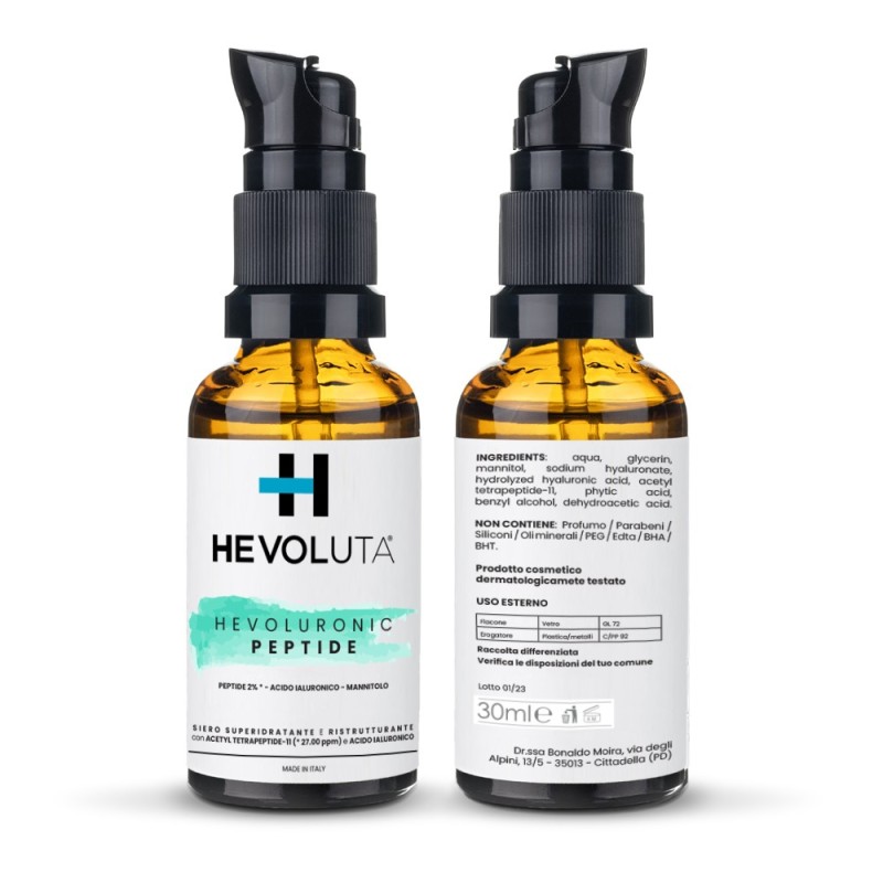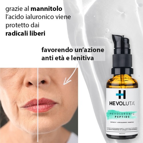 Grazie alla presenza in esso di due tipi di acido ialuronico (a bassissimo Peso Molecolare e ad altissimo Peso Molecolare), del peptide acetyl tetrapeptide-11 e del mannitolo, Hevoluronic Peptide riduce la presenza di rughe e linee sottili e migliora l'elasticità della pelle.