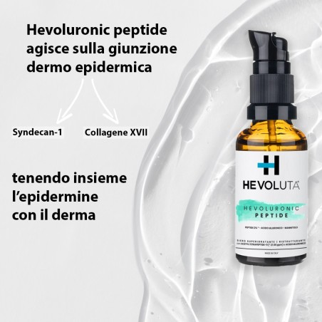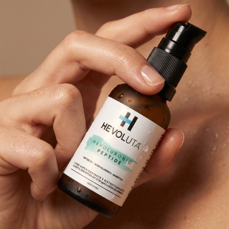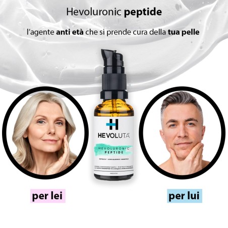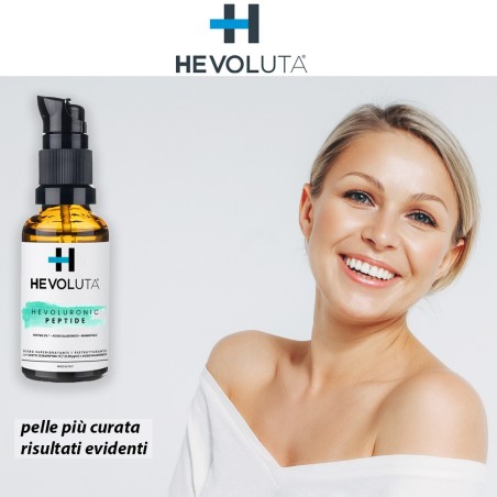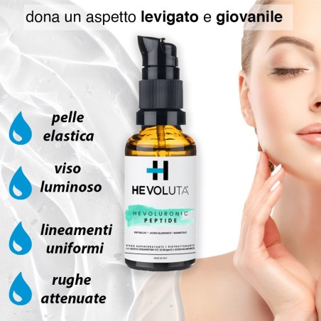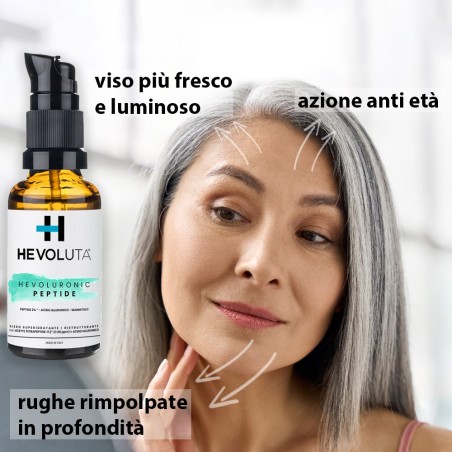 Hevoluronic Peptide è un siero per il viso con acido ialuronico e un peptide specifico, che idrata in profondità, riduce i segni del tempo e dona alla tua pelle un aspetto radioso e più fresco, giorno dopo giorno.
